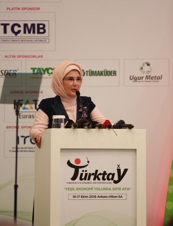 Programda konuşan Cumhurbaşkanı Recep Tayyip Erdoğan’ın eşi Emine Erdoğan “Zamana karşı yarışımızda, kazanan taraf olmak istiyorsak, yeşil ekonomiye geçişi hızlandırmalıyız. Yeşil bir ekonomiyle gelir ve istihdamı artırabiliriz. Temiz suya ve enerjiye erişimi iyileştirebiliriz. Atıkların ve karbon salınımının azaltılması, biyolojik çeşitliliğin ve ekosistemlerin koruması mümkün olabilir. Yani bugün yakın geleceğimizle ilgili çizilen felaket senaryolarını tersine çevirmenin bir yolu varsa, o da yeşil ekonomiye geçiştir. Bu noktada en önemli adım, sıfır atık yaklaşımıdır." şeklinde konuştu.