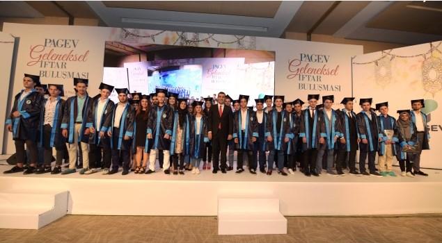 Başkan Yavuz Eroğlu’nun konuşmasın ardından, PAGEV’in eğitim misyonu çerçevesinde Türk plastik sektörü temsilcilerinin katkıları ve destekleri ile hayata geçirilerek Milli Eğitim Bakanlığı’na devredilen ve tematik okul kapsamına alınan Küçükçekmece PAGEV Mesleki ve Teknik Anadolu Lisesi’nin, 2013-2014 eğitim ve öğretim yılında kabul ettiği ilk öğrencilerinin mezuniyet töreni de geleneksel iftar yemeğinde gerçekleşti. Bu yıl ilk mezunlarını veren 1000 öğrenci kapasiteli lise, plastik sektörüne eğitimli eleman yetiştirerek sektördeki eğitimli eleman açığına destek oluyor.