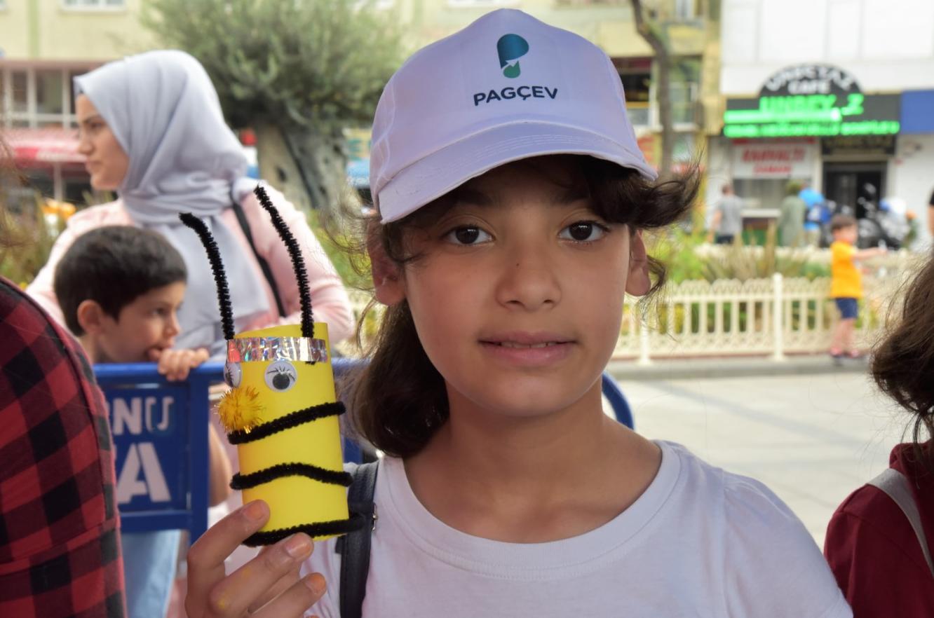 İlkokul öğrencisi Berfin Gülyaman; “Buradaki çevre etkinliğinde çevreyi korumamız gerektiğini ve çöpleri geri dönüşüm kutularına atarak çevreyi kirletmemeyi öğrendik. Cam, kâğıt, plastik geri dönüşüm ve pil geri dönüşüm kutuları var. Atıklarımı farklı kutulara atarak ayrıştırabiliyoruz. Burada bazı arkadaşlarımız arı yaptı. Ben kalem kutusu yapmaya çalıştım. Bunları yapmak için rulo, süs ve boya kullandık.” dedi