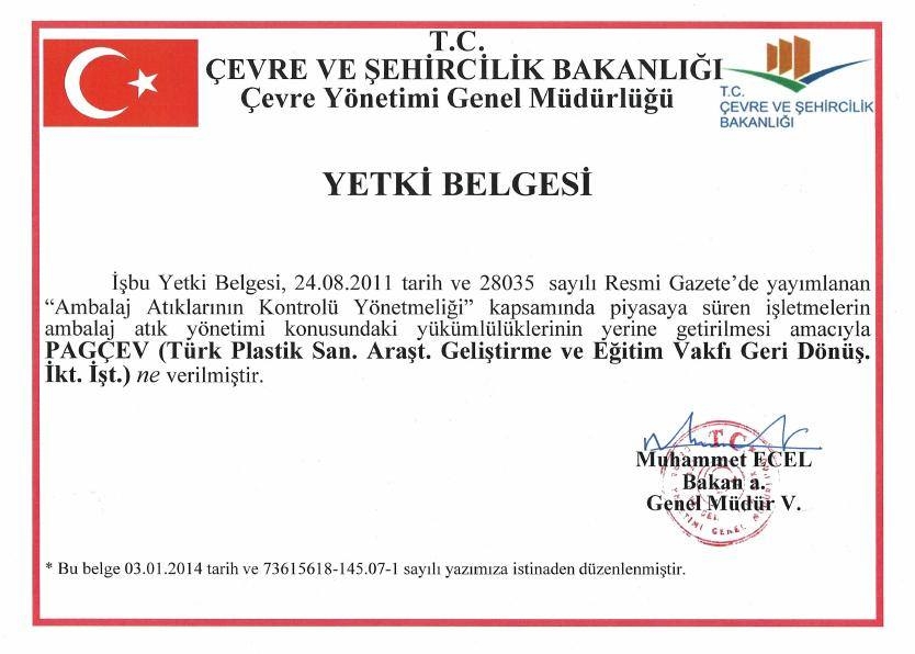 “İlham Kaynağımız Türk Plastik Sanayicileri Araştırma Geliştirme ve Eğitim Vakfı Geri Dönüşüm İktisadi İşletmesi (PAGÇEV) ‘in Bakanlık Yetki Belgesi.”